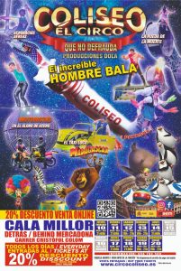 Circo Coliseo en CALA MILLOR presenta Madagascar del 10 al 20 de julio El Circo Coliseo en CALA MILLOR trae un espectáculo esencialmente familiar, artísticamente ambicioso, que propone a todos los espectadores acercamiento y respeto hacia el mundo del circo, dejándoles ver que con pasión y perseverancia todo los retos se cumple. Guiados por nuestros queridos payasos viviremos esta experiencia de manera inolvidable, desde la risa y el entretenimiento. Las localidades de Palco son a precio único. Las localidades de Grada son a precio adulto o niño (Con 2 años hasta 17 años pagan como niño ambos incluidos). MENORES DE 24...