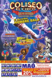 Circo Coliseo en Maó presenta Madagascar del 23 de mayo al 8 de junio El Circo Coliseo en Maó trae un espectáculo esencialmente familiar, artísticamente ambicioso, que propone a todos los espectadores acercamiento y respeto hacia el mundo del circo, dejándoles ver que con pasión y perseverancia todo los retos se cumple. Guiados por nuestros queridos payasos viviremos esta experiencia de manera inolvidable, desde la risa y el entretenimiento. Las localidades de Palco son a precio único. Las localidades de Grada son a precio adulto o niño (Con 2 años hasta 17 años pagan como niño ambos incluidos). MENORES DE...