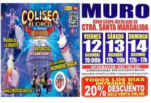 Circo Coliseo en MURO presenta Madagascar del 12 al 14 de diciembre Circo Coliseo en Muro trae un espectáculo esencialmente familiar, artísticamente ambicioso, que propone a todos los espectadores acercamiento y respeto hacia el mundo del circo, dejándoles ver que con pasión y perseverancia todo los retos se cumple. Guiados por nuestros queridos payasos viviremos esta experiencia de manera inolvidable, desde la risa y el entretenimiento. Las localidades de Palco son a precio único. Las localidades de Grada son a precio adulto o niño (Con 2 años hasta 17 años pagan como niño ambos incluidos). MENORES DE 24...